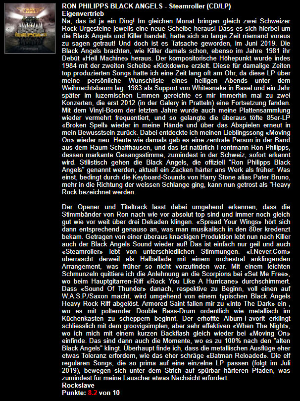 Na, das ist ja ein Ding! Im gleichen Monat bringen gleich zwei Schweizer Rock Urgesteine jeweils eine neue Scheibe heraus! Dass es sich hierbei um die Black Angels und Killer handelt, hätte sich so lange Zeit niemand voraus zu sagen getraut! Und doch ist es Tatsache geworden, im Juni 2019. Die Black Angels brachten, wie Killer damals schon, ebenso im Jahre 1981 ihr Debüt «Hell Machine» heraus. Der kompositorische Höhepunkt wurde indes 1984 mit der zweiten Scheibe «Kickdown» erzielt. Diese für damalige Zeiten top produzierten Songs hatte ich eine Zeit lang oft am Ohr, da diese LP über meine persönliche Wunschliste eines heiligen Abends unter dem Weihnachtsbaum lag. 1983 als Support von Whitesnake in Basel und ein Jahr später im luzernischen Emmen gereichte es mir immerhin mal zu zwei Konzerten, die erst 2012 (in der Galery in Pratteln) eine Fortsetzung fanden. Mit dem Vinyl-Boom der letzten Jahre wurde auch meine Plattensammlung wieder vermehrt frequentiert, und so gelangte die überaus töfte 85er-LP «Broken Spell» wieder in meine Hände und über das Abspielen erneut in mein Bewusstsein zurück. Dabei entdeckte ich meinen Lieblingssong «Moving On» wieder neu. Heute wie damals gab es eine zentrale Person in der Band aus dem Raum Schaffhausen, und das ist natürlich Frontmann Ron Philipps, dessen markante Gesangsstimme, zumindest in der Schweiz, sofort erkannt wird. Stilistisch gehen die Black Angels, die offiziell "Ron Philipps Black Angels" genannt werden, aktuell ein Zacken härter ans Werk als früher. Was einst, bedingt durch die Keyboard-Sounds von Harry Stone alias Pater Bruno, mehr in die Richtung der weissen Schlange ging, kann nun getrost als "Heavy Rock bezeichnet werden.